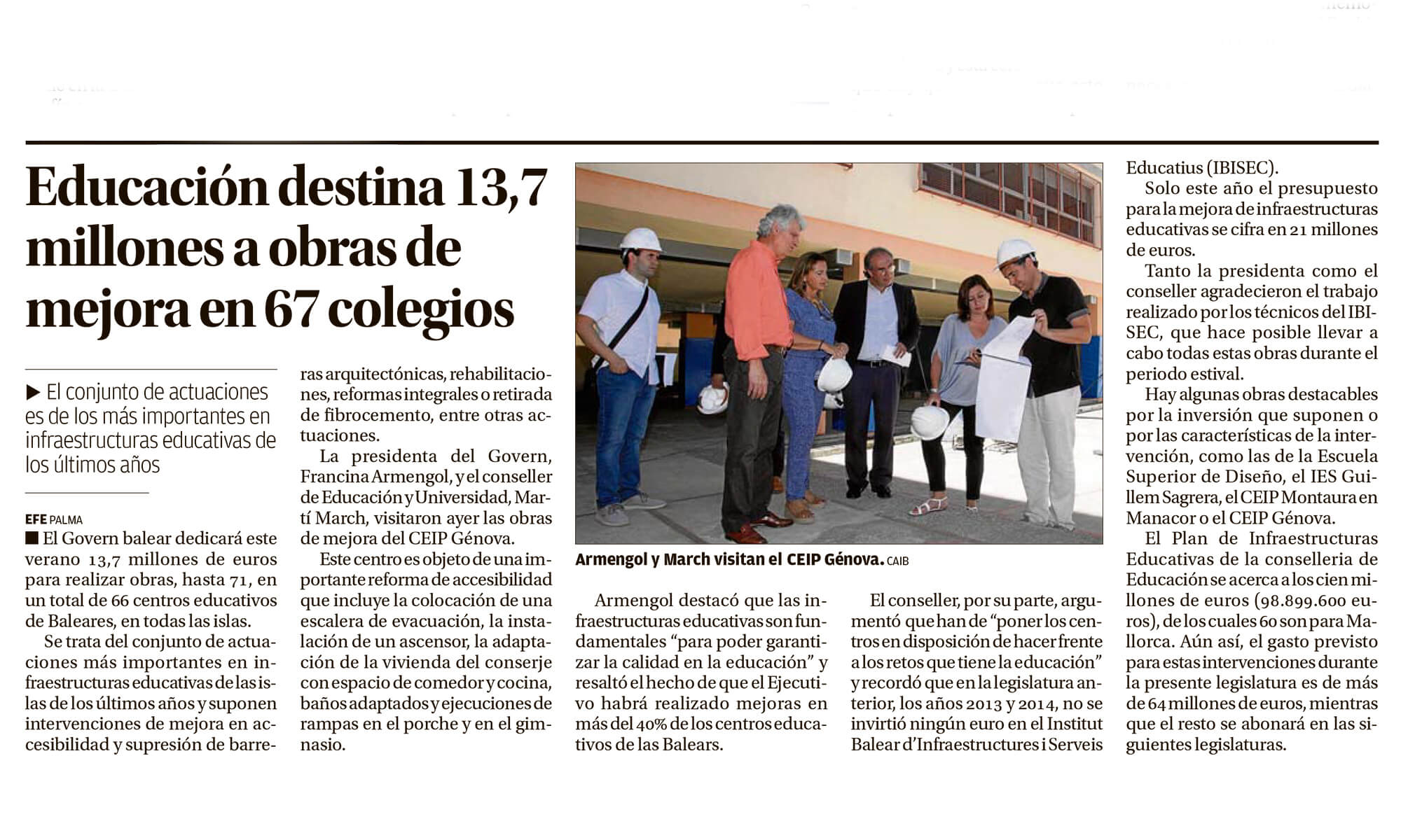 Este centro es objeto de una importante reforma para la accesibilidad, que incluye la instalación de una escalera de emergencia, un ascensor, la rehabilitación de la casa del guardián, la reforma de aseos y la instalación de rampas en el porche y el gimnasio. El 4 de julio, la presidenta del Govern de les Illes Balears, Francina Armengol, y el concejal de Educación y Universidades, Martí March, visitan las obras del CEIP Génova junto al arquitecto Miquel Lacomba.