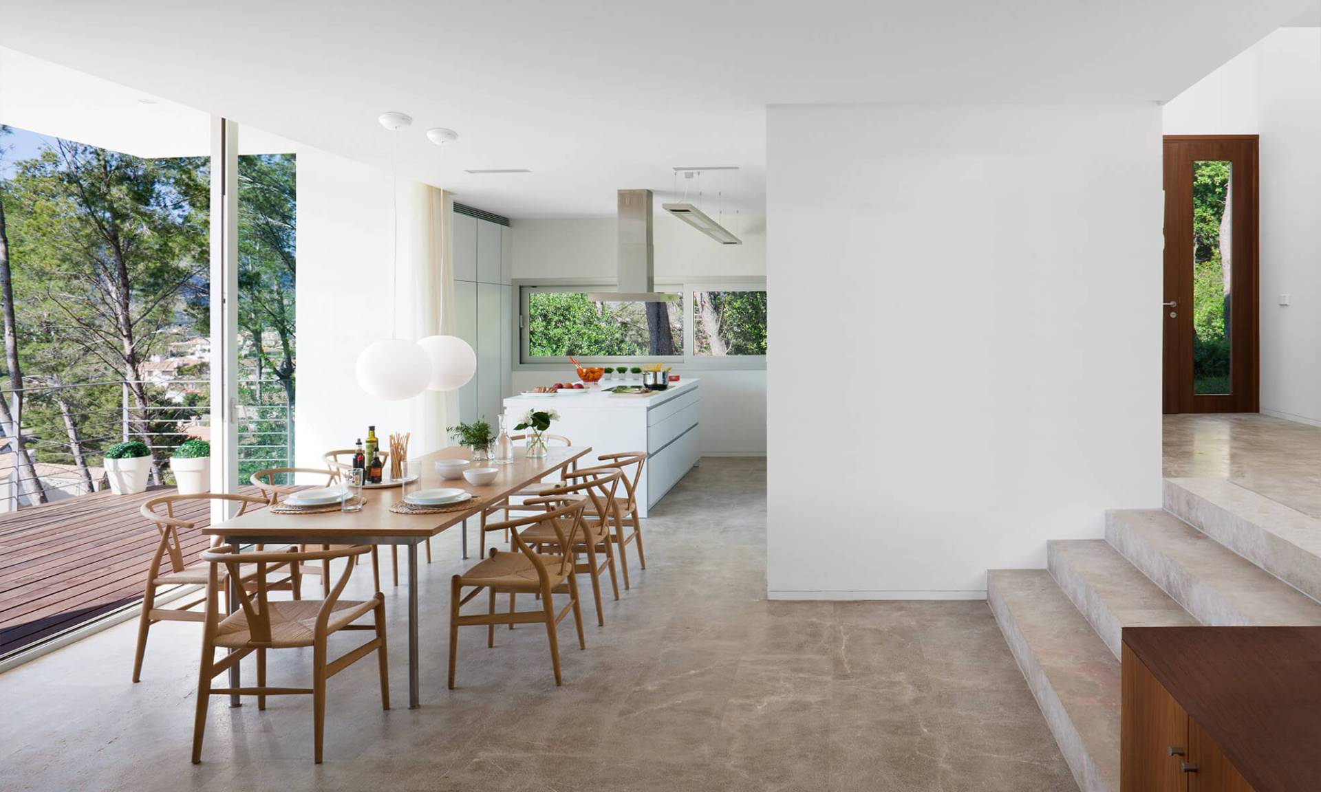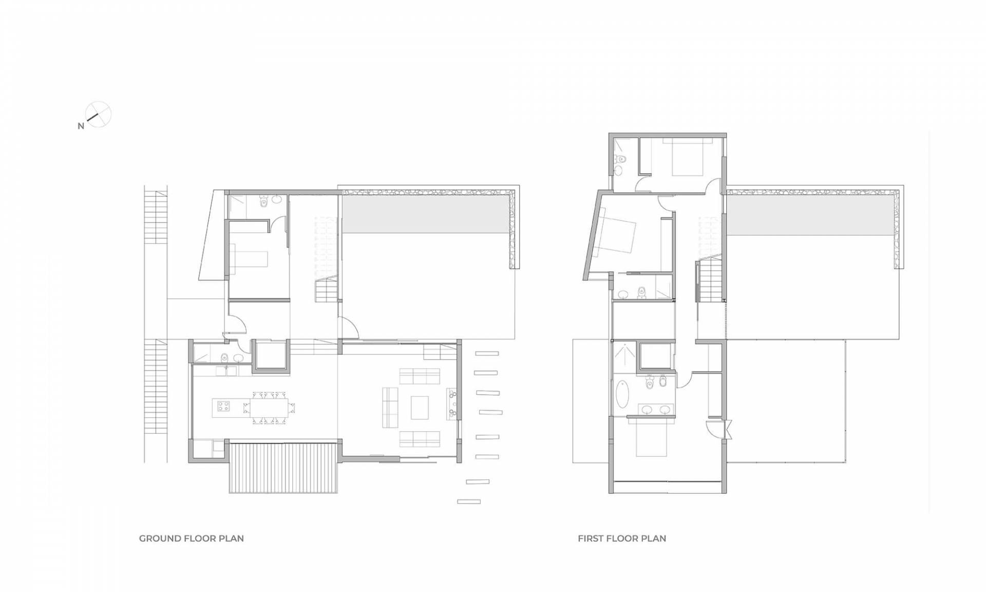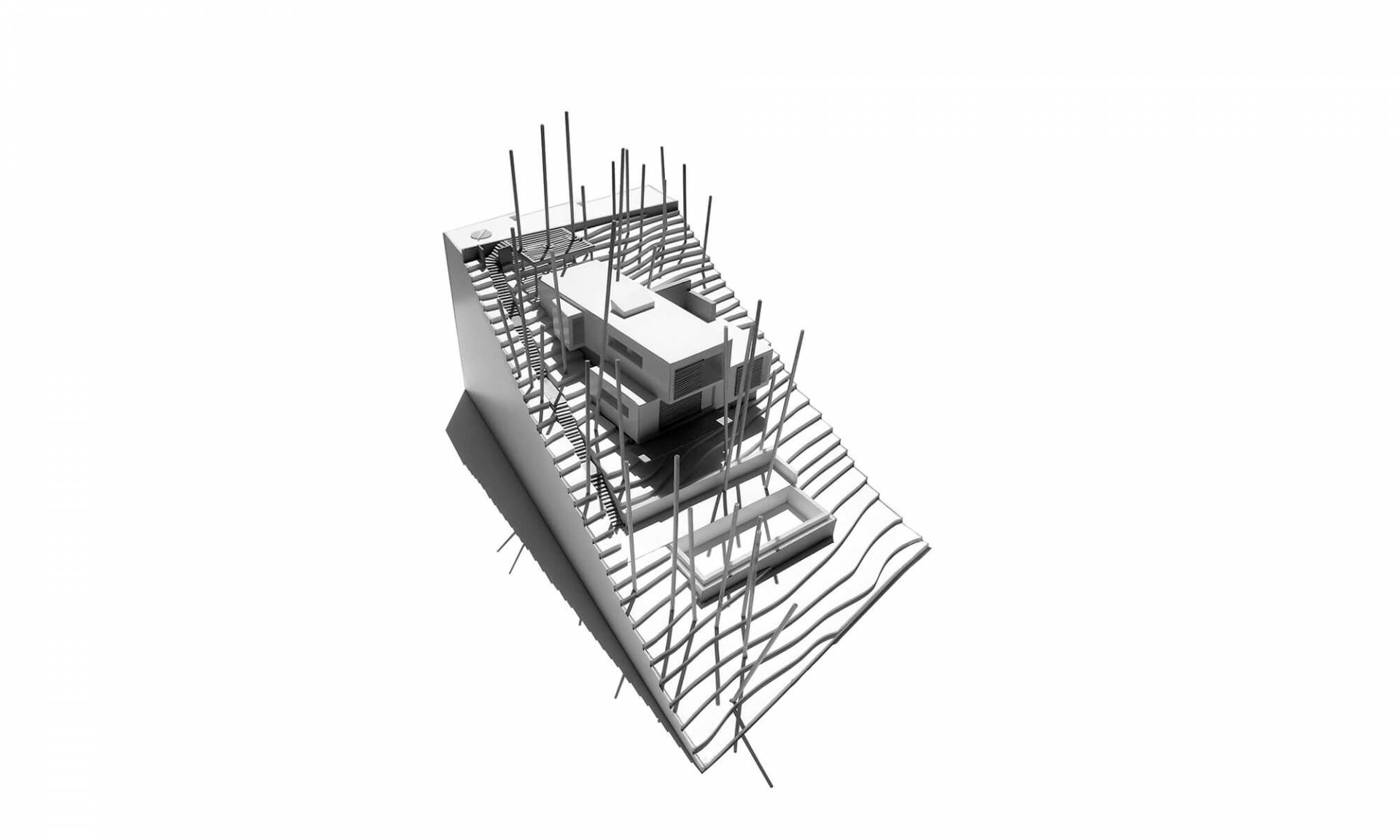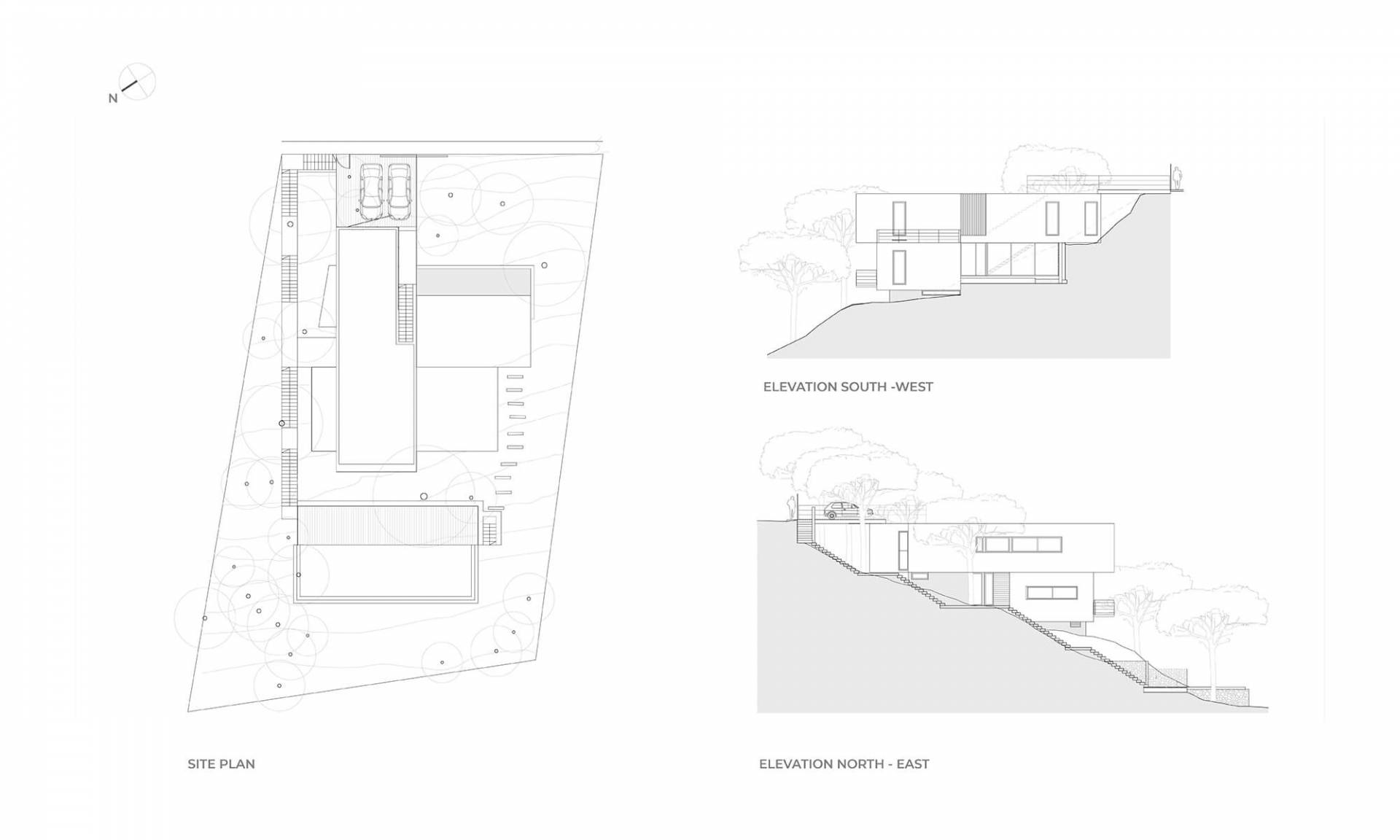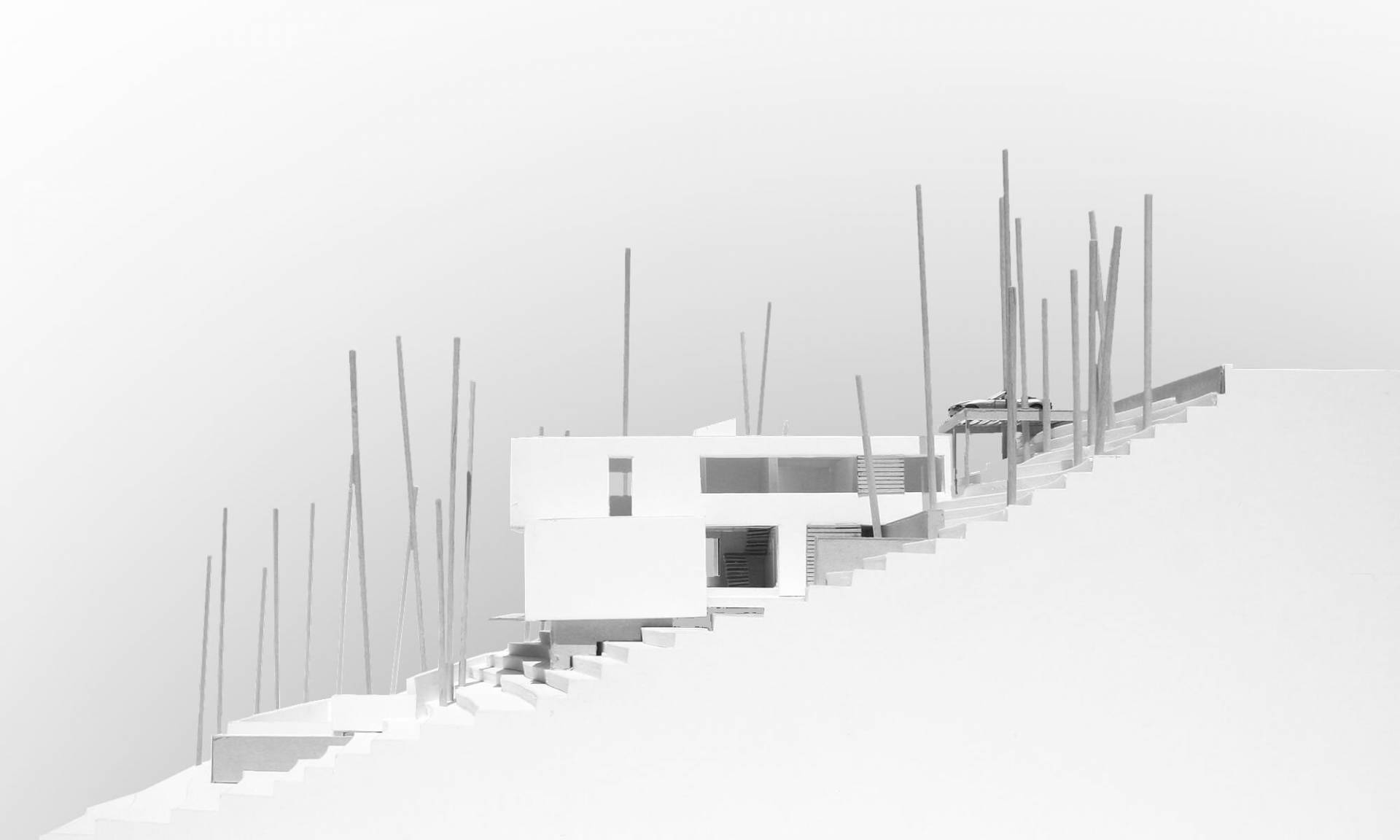 The steep slope of the plot and its location towards the north where there are views over the mountains and the forest, have been essential in providing the guidelines for this design. The execution of the project seeks to maintain the pine and oak tree forests, and avoiding the displacement of great amounts of soil. Consequently, the parking area is levelled to the public road, designed with a light structure amidst the trees, avoiding, therefore, the use of inconvenient slopes into the ground. The distribution of the spaces in the building allowed the construction of a south facing deck, as well as the living room, enjoying a warm and intimate space. The possibility of entering the house through the roof, implies the construction of an exterior staircase integrated in the first floor, where the bedrooms are located. On the ground floor, the living, dining and kitchen areas are situated in one single space. This floor is also double-oriented: to the south facing deck and to the north facing landscape views. The studio, in front of the main house, also enjoys the views thanks to a sliding wooden door. The communication with the exterior is organised through a clear axis, with the staircase that adapts itself to the natural environment respecting the trees along its course.