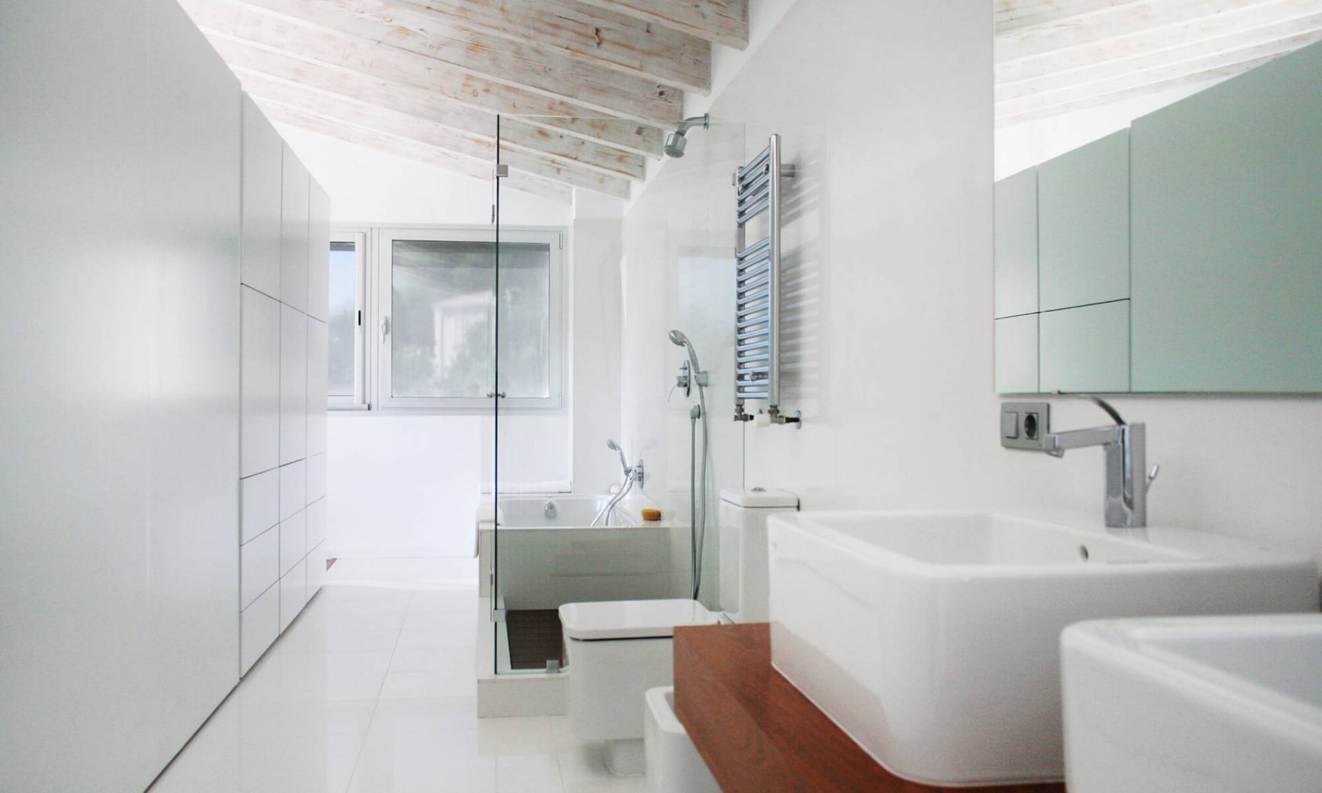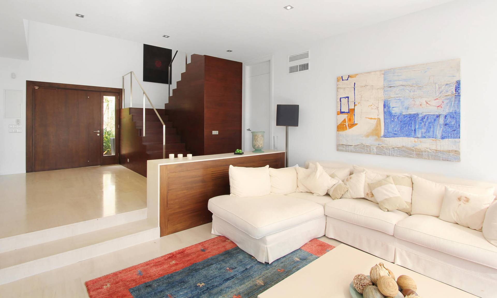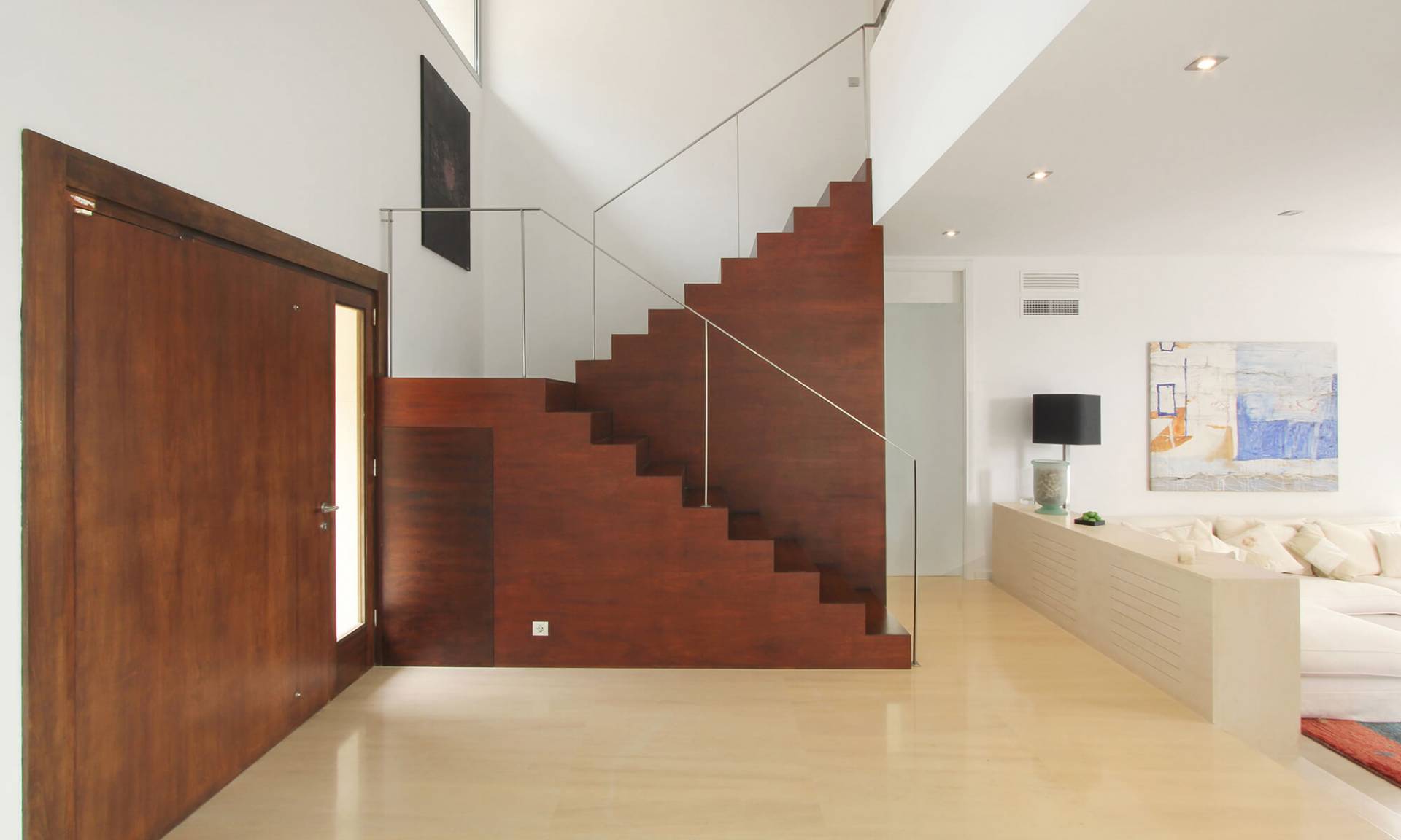 La vivienda se sitúa en un solar privilegiado, con magnificas vistas y orientación sur. El diseño busca replantear las formas sencillas de la arquitectura vernácula. Se intenta minimizar la cantidad de materiales para los acabados, piedra arenisca para revestimientos exteriores y solados de planta baja, carpintería de aluminio anodizado gris, paredes y techos interiores pintados de blanco. En el hall de entrada aparece de manera escultórica la escalera, revestida de madera, que invita a subir a la planta piso donde se sitúan los dormitorios.