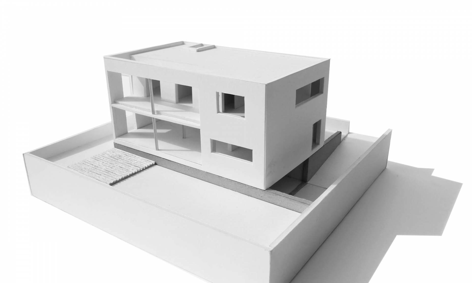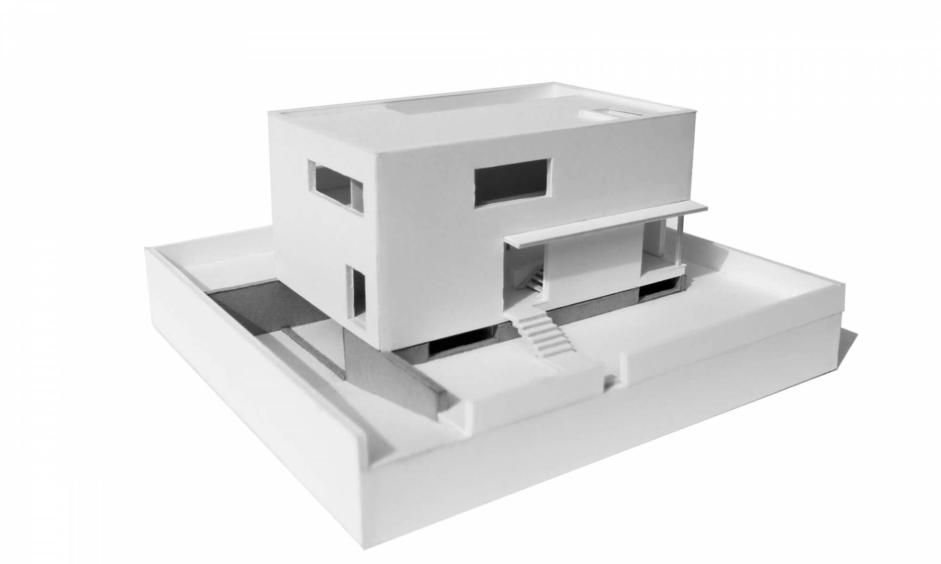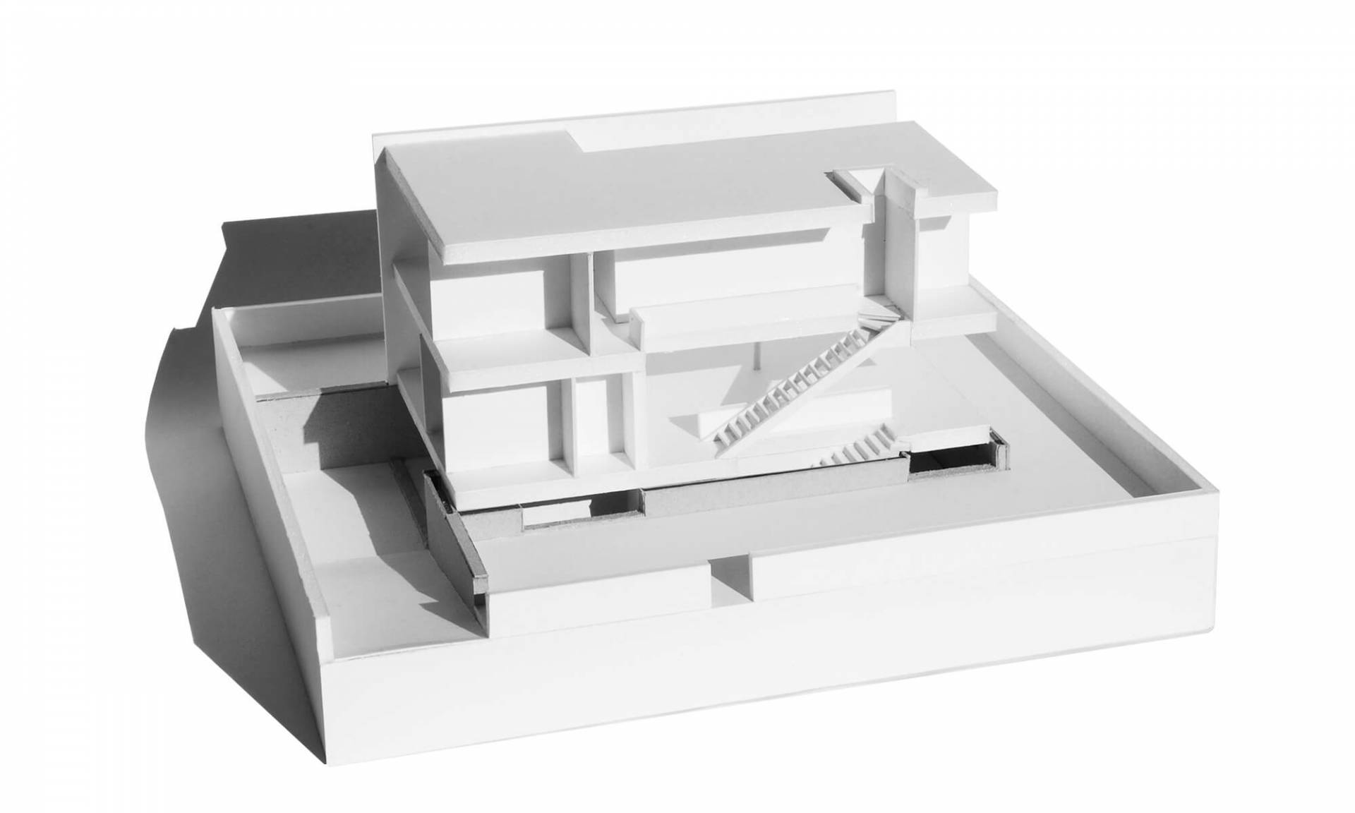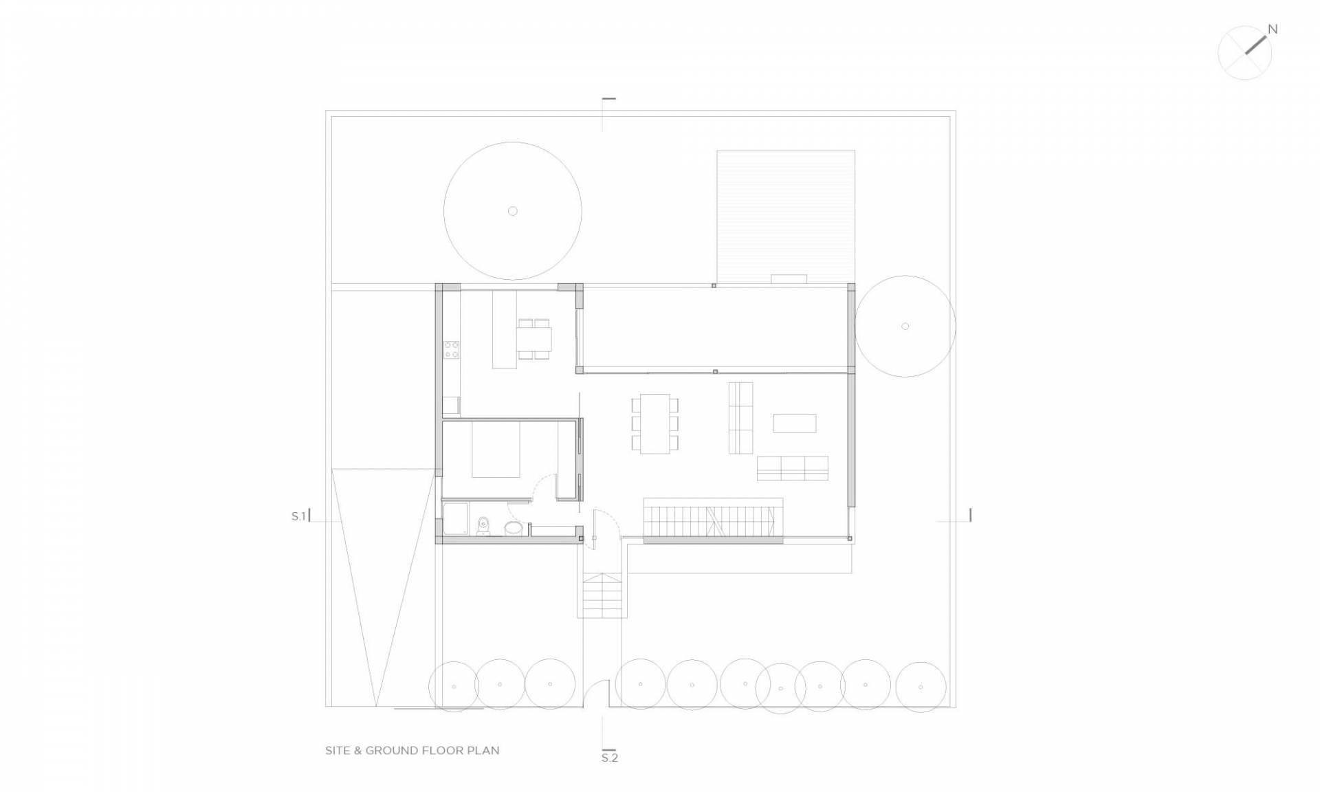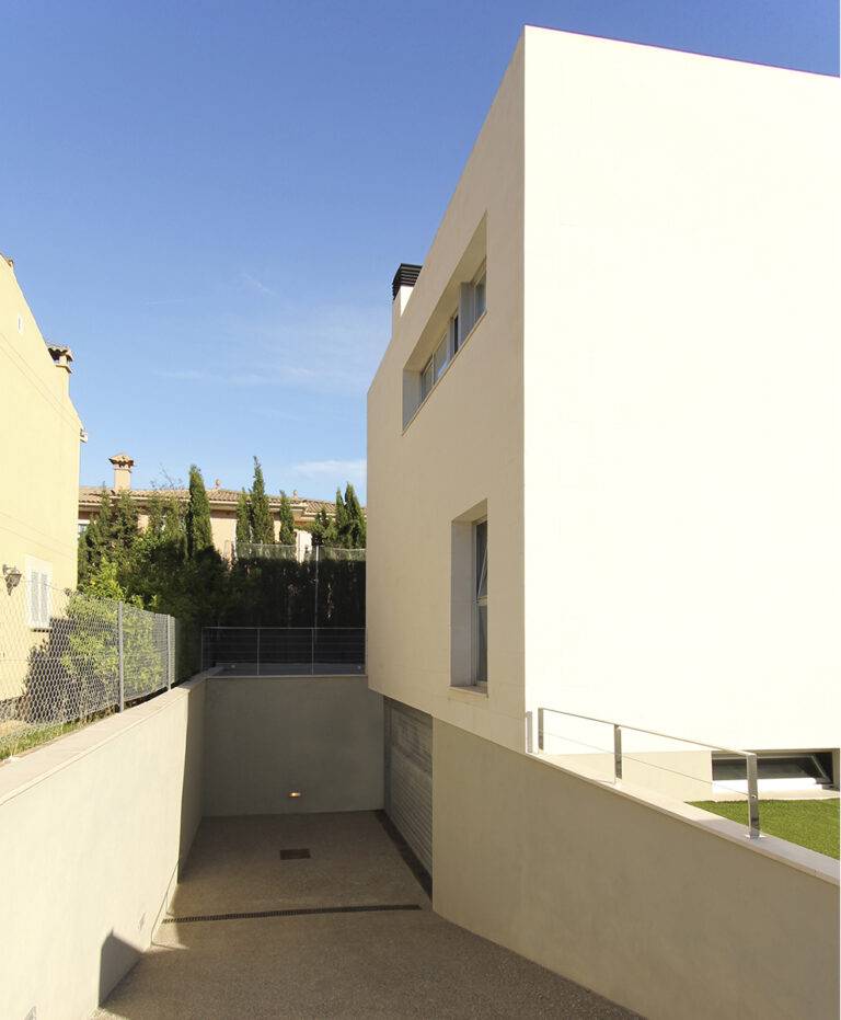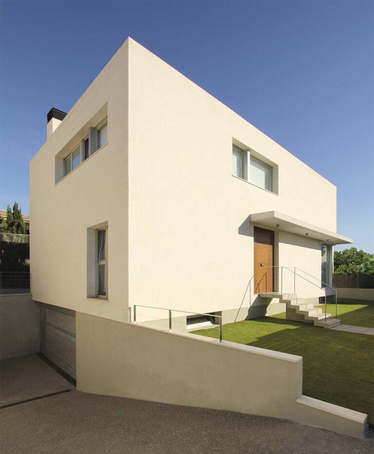 En un barrio residencial de baja densidad, se sitúa esta vivienda unifamiliar aislada. El solar dispone de buena orientación, permitiendo situar hacia el sur la mayoría de estancias de la casa.El edificio se adapta al terreno elevándose lo necesario para poder situar la rampa de acceso al garaje de planta sótano.La fachada principal se separa de la alineación a vial creando un jardín de entrada, que actúa de filtro de lo público a lo más privado.En planta baja se sitúan la cocina y el estar-comedor, orientados a sur y abiertos al jardín. Una escalera ligera, integrada en el espacio de estar-comedor accede a la planta piso donde están los dormitorios.