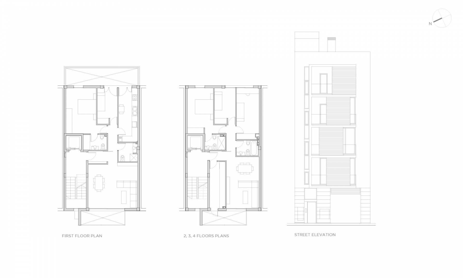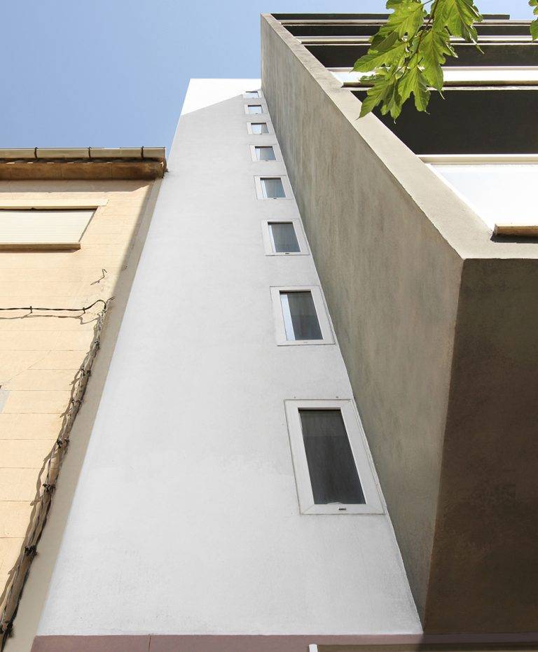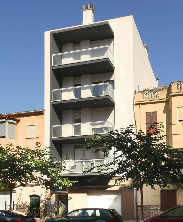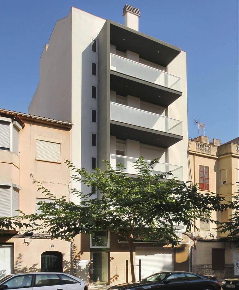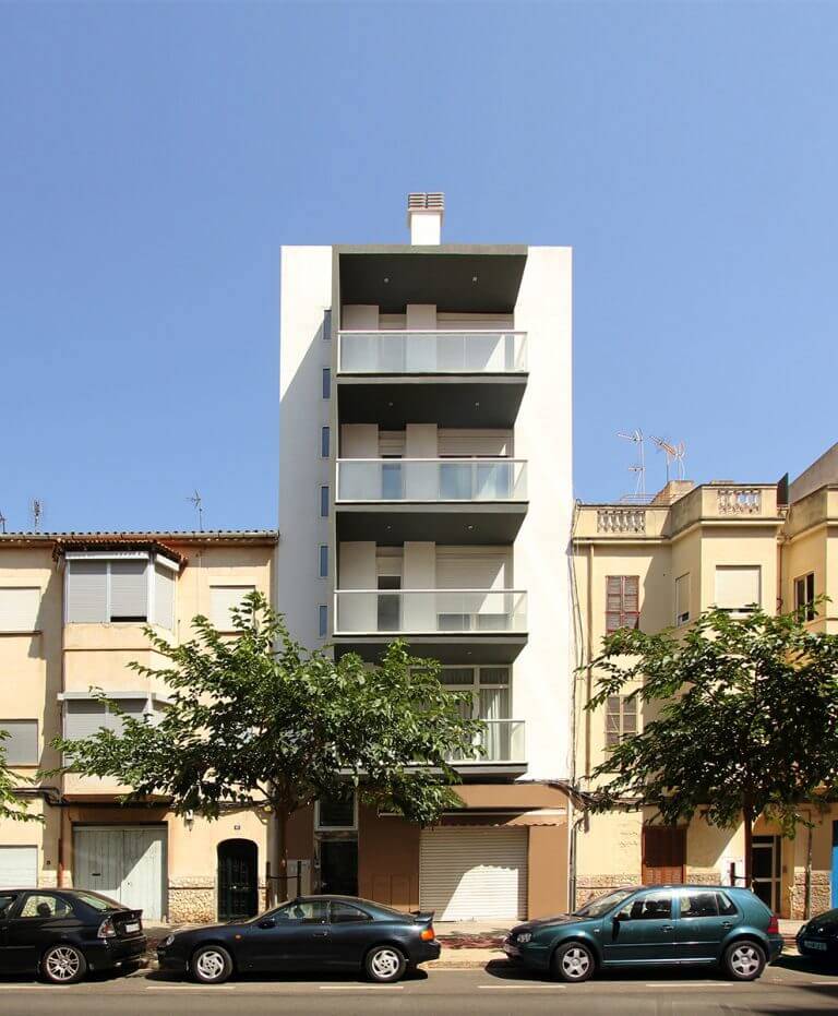 En el ensanche de la ciudad, en un contexto claramente urbano, se sitúa este edificio entre medianeras, de cuatro viviendas y un local de uso comercial. Se resuelve la fragmentación que supone tener cuatro balcones en una fachada, unificándolos en un solo elemento en forma de peine, abriéndose al sur, y contrastando cromáticamente con el resto de la fachada.Las viviendas aprovechan la doble orientación de sus fachadas, obteniendo ventilaciones cruzadas y asegurando un correcto asoleamiento.
