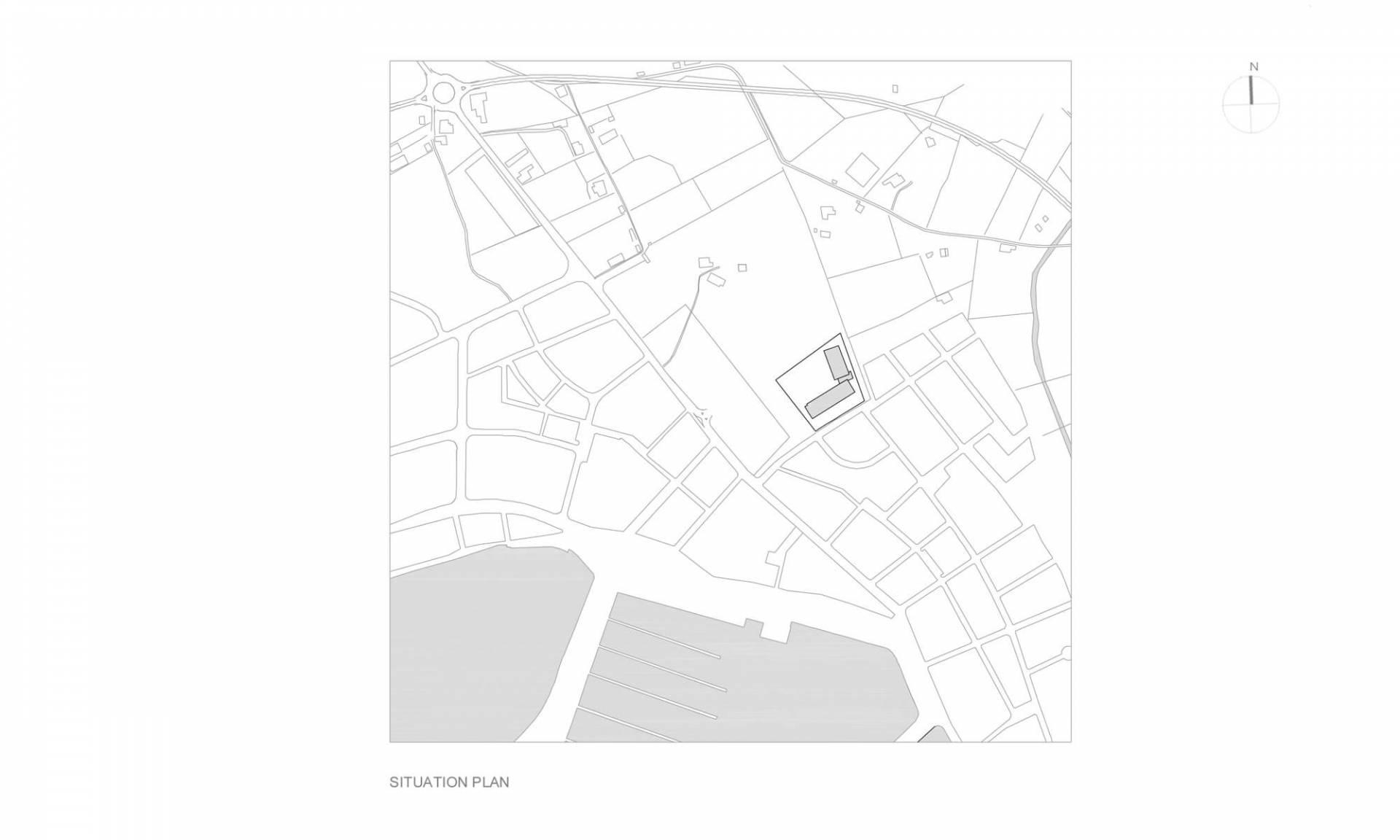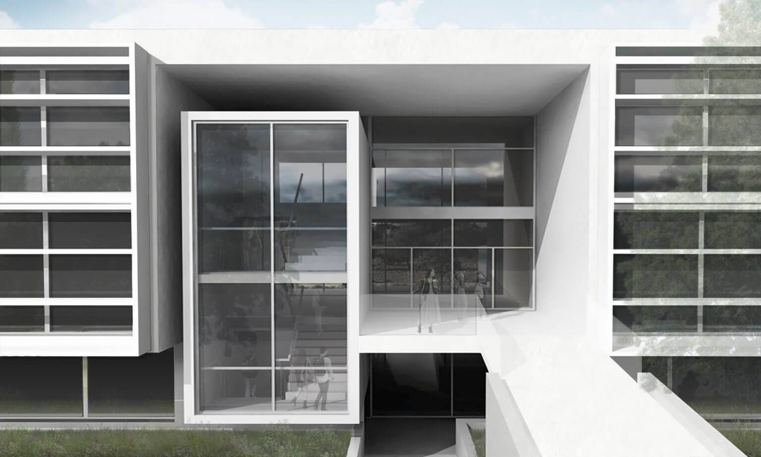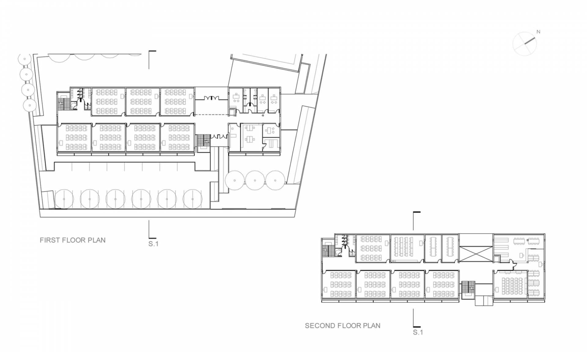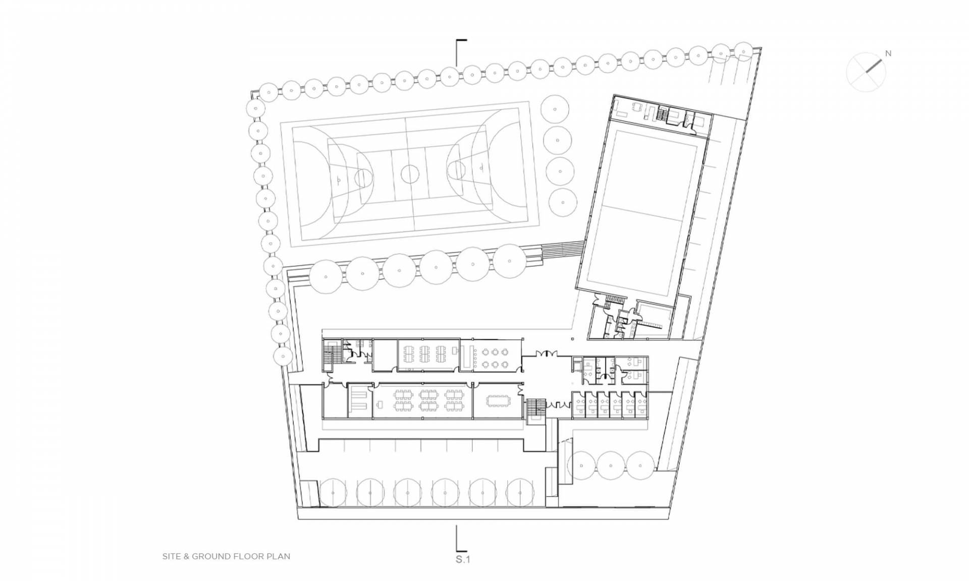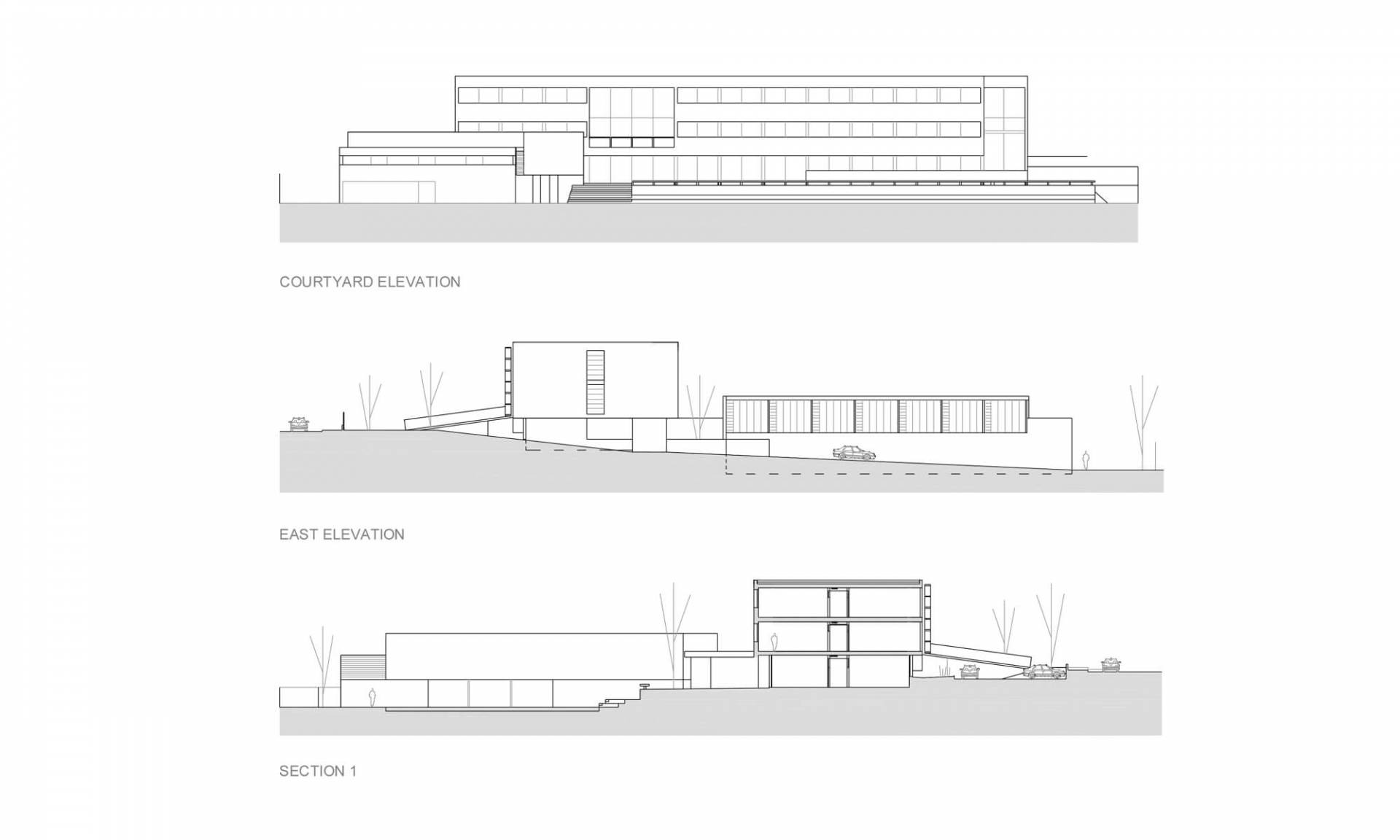 Los dos volúmenes alineados con las calles, ayudan a configurar esta nueva trama urbana. La organización del edificio se resuelve a partir de la situación del acceso principal, que se produce por la planta primera del edificio de aulas, aprovechando la ligera pendiente de la calle y minimizando así los recorridos verticales.Todo el edificio se ha estudiado para conseguir el máximo aprovechamiento pasivo de la energía solar: un reducido factor de forma y máxima apertura a sudeste con protección de “brise –soleil” para evitar el sol del verano y captarlo en invierno.