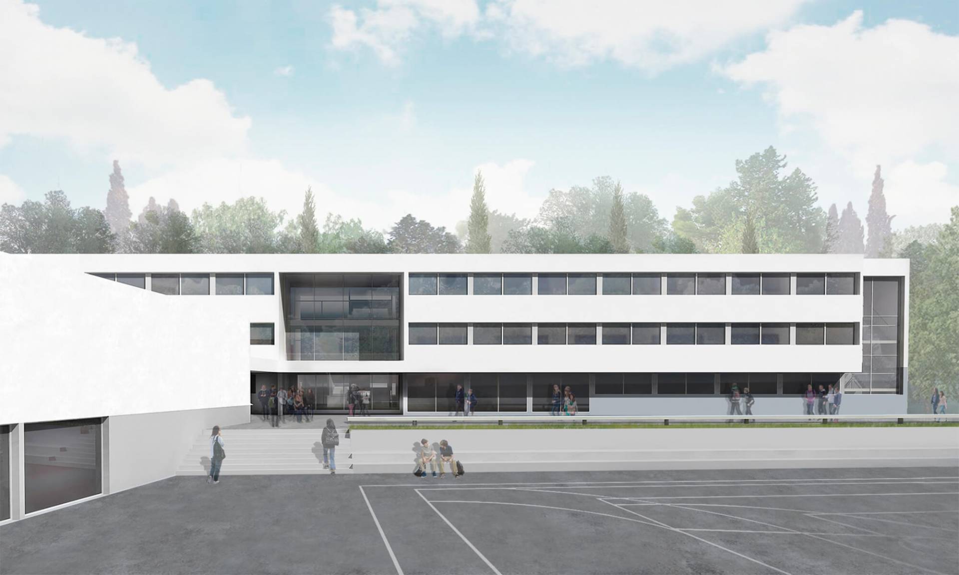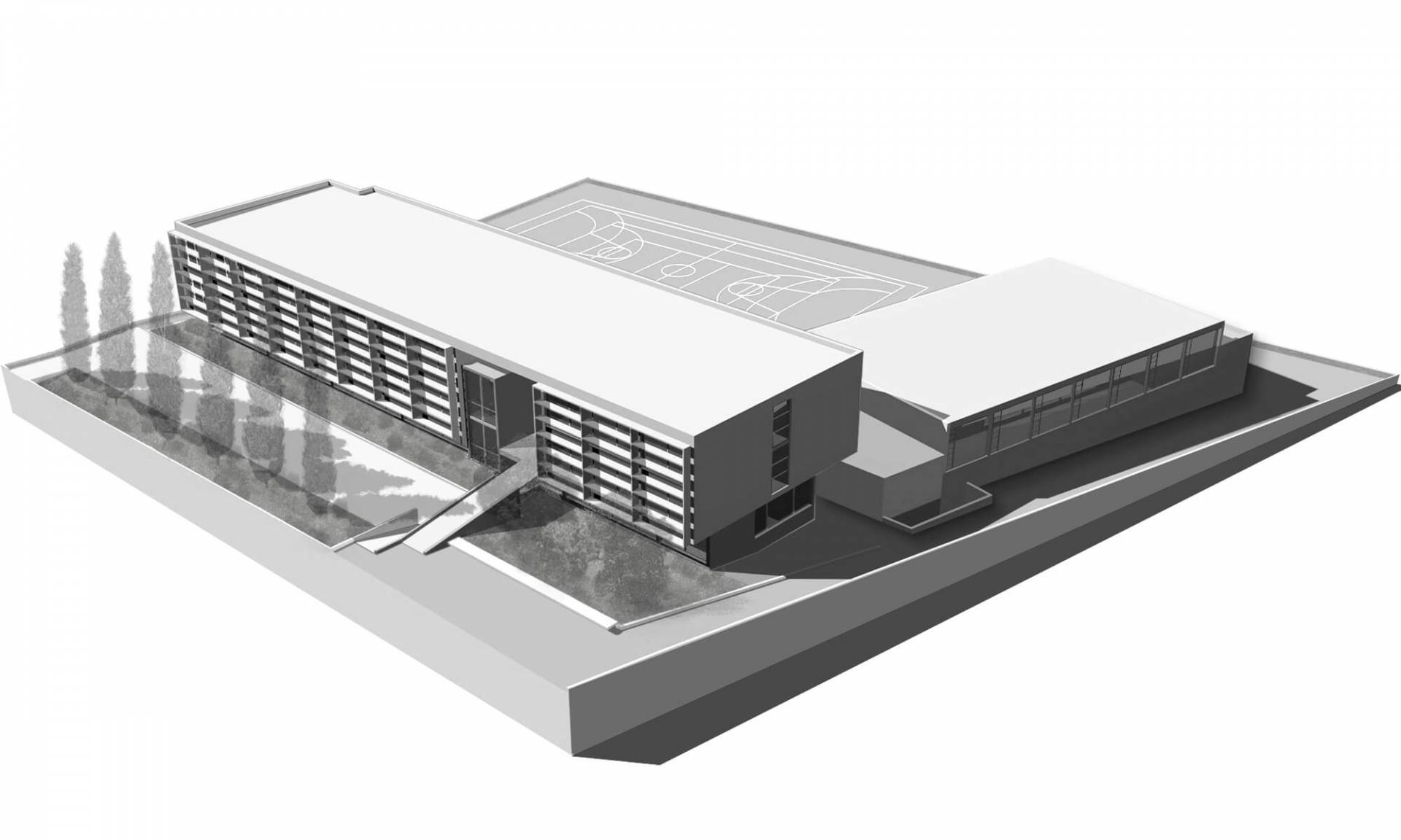 El edificio se resuelve con un bloque principal, paralelo a la calle de acceso, que aprovecha al máximo la buena orientación sudeste y otro volumen que contiene el gimnasio, situado a una cota más baja para adaptarse al terreno.