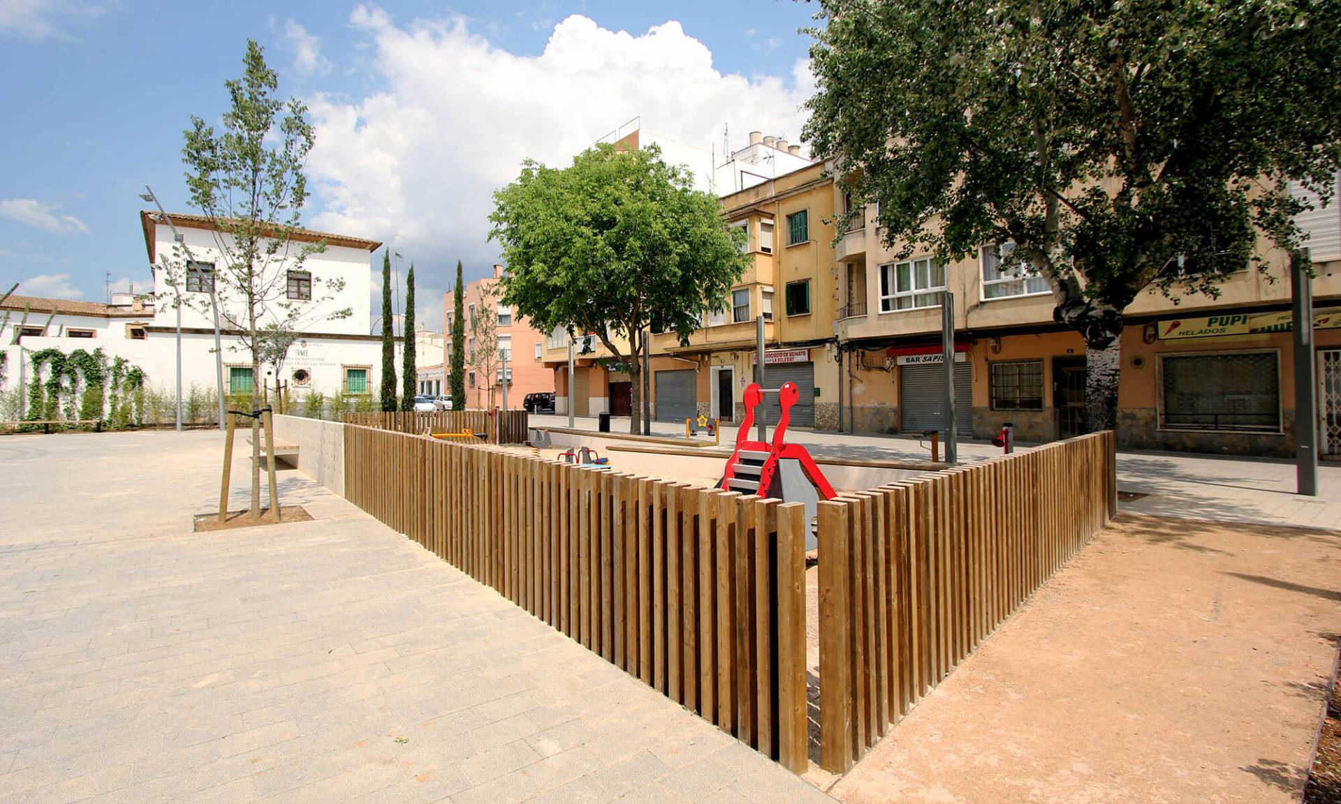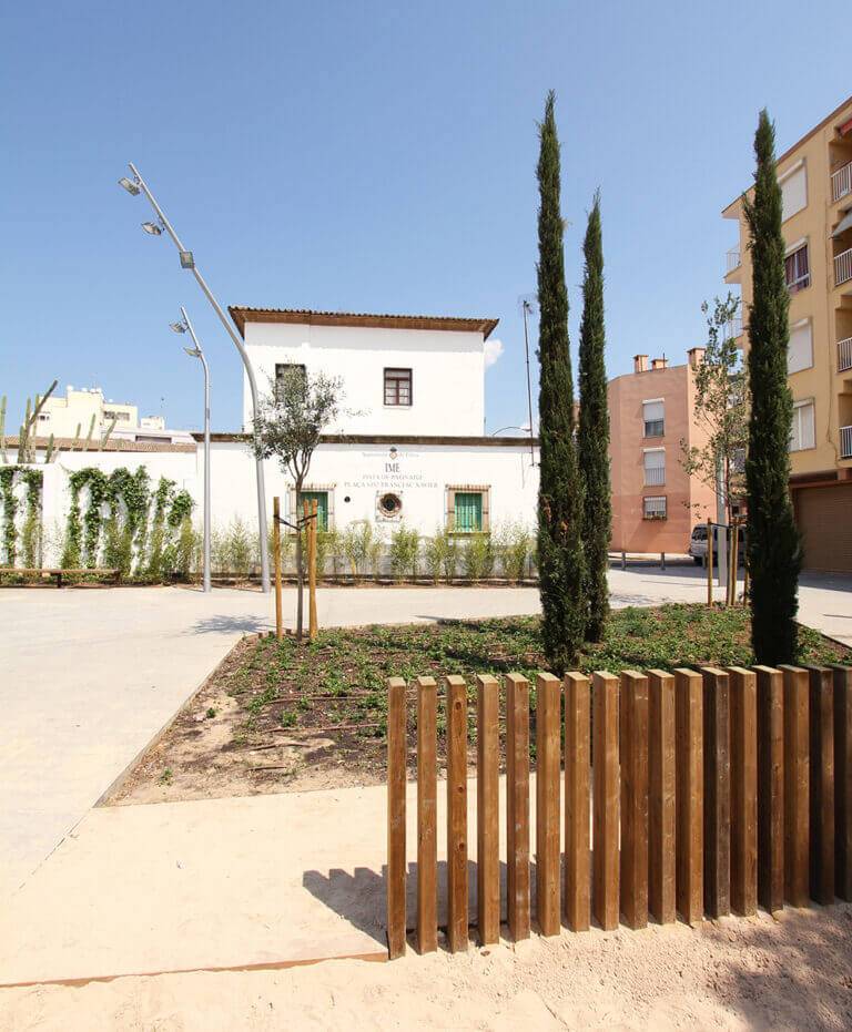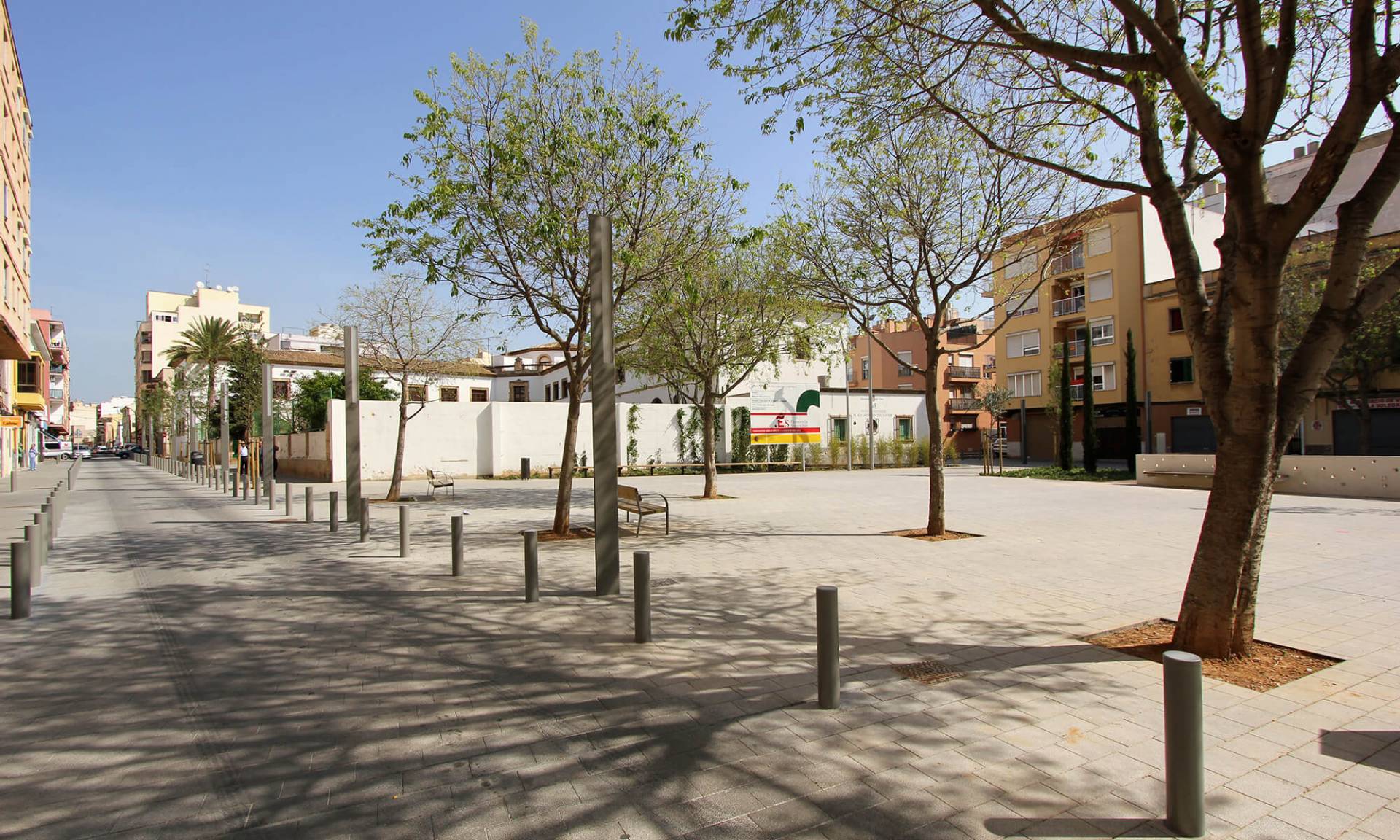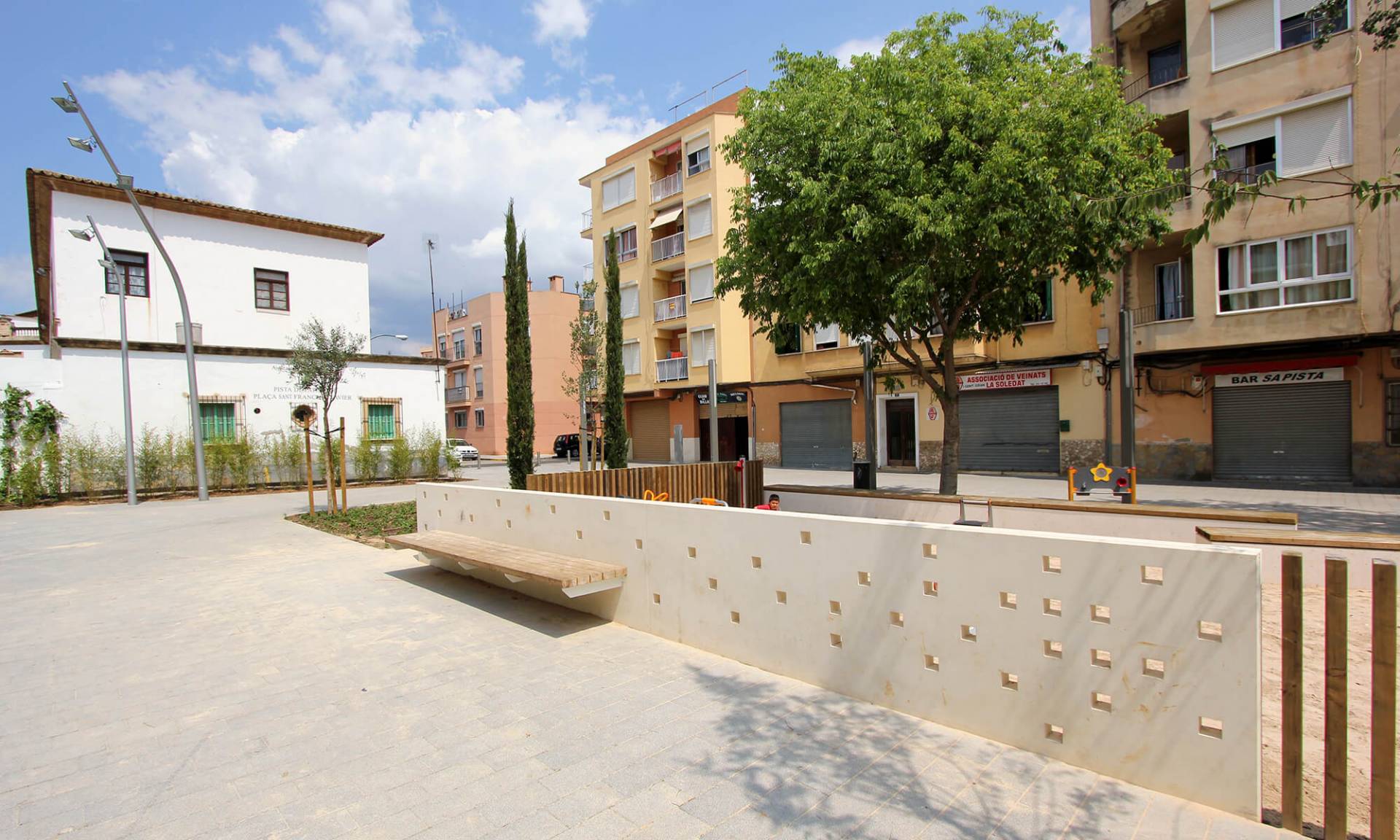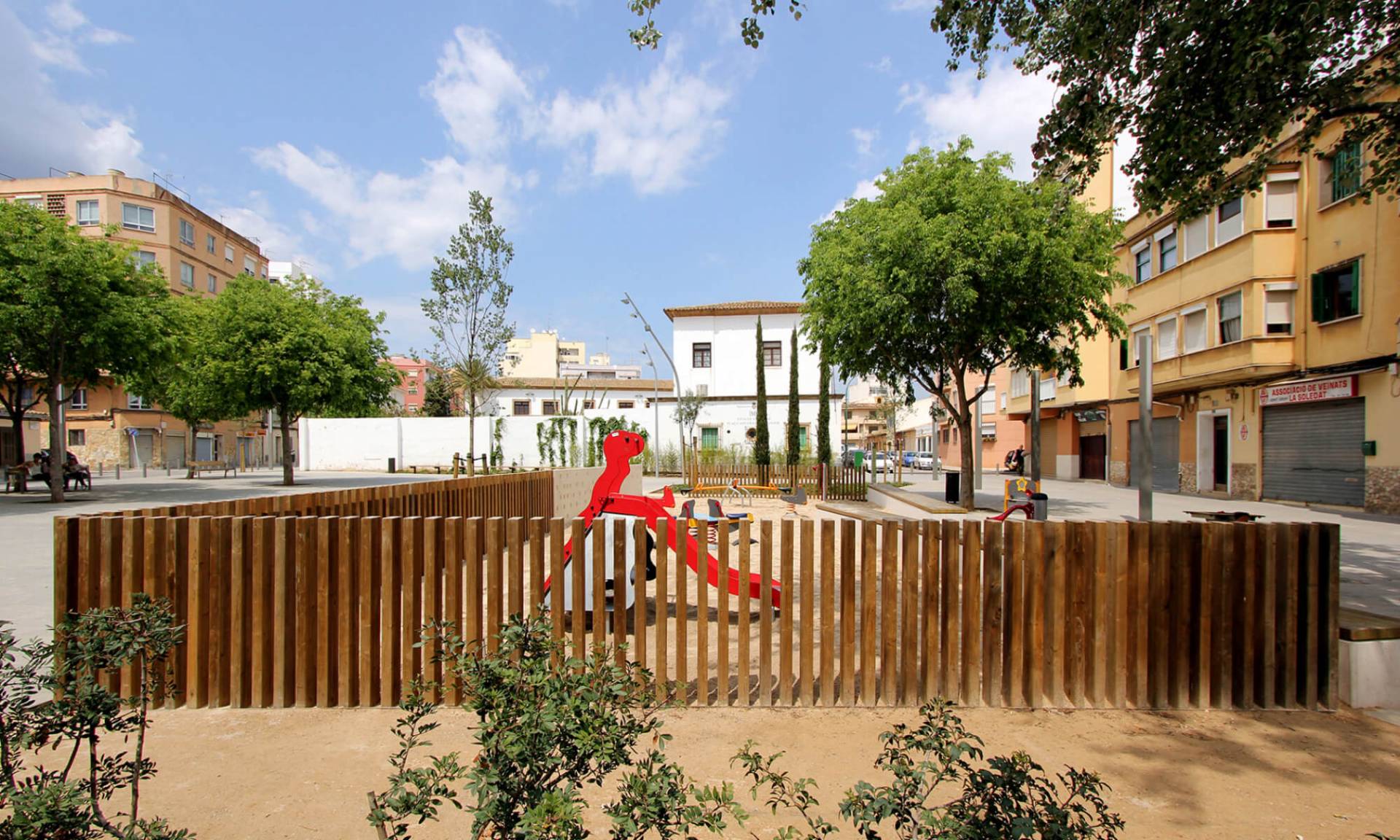 En el barrio de la Soledat Nord, con déficit de espacios públicos, nace la propuesta que busca la dignificación de un ámbito urbano malogrado, pavimentando la calle de donde se accede a la escuela vecina y el resto de calles alrededor de la plaza, consiguiendo una sensación de nitidez y amplitud de espacio. Se eliminan así las barreras existentes entre las fachadas de la plaza y el espacio público, permitiendo que varios usos puedan participar de este nuevo espacio con actividades al aire libre. El espacio principal es de forma trapezoidal, con una suave pendiente orientada hacia el sur, donde el edificio de la escuela de comienzo del siglo XX y con alto valor arquitectónico, constituye una referencia en la zona.