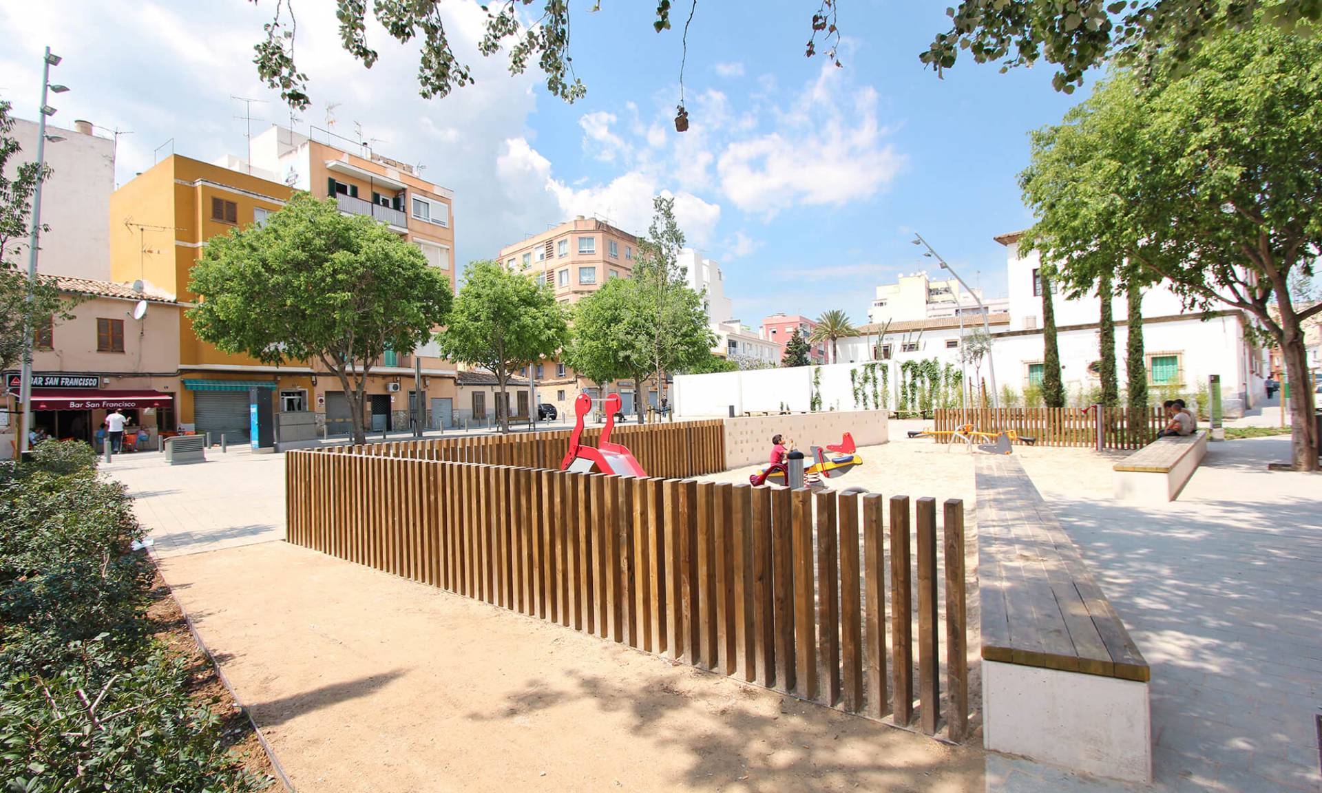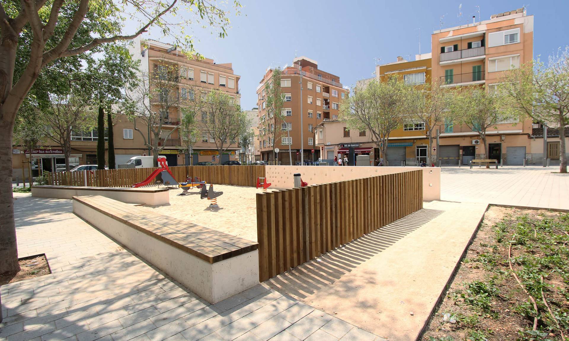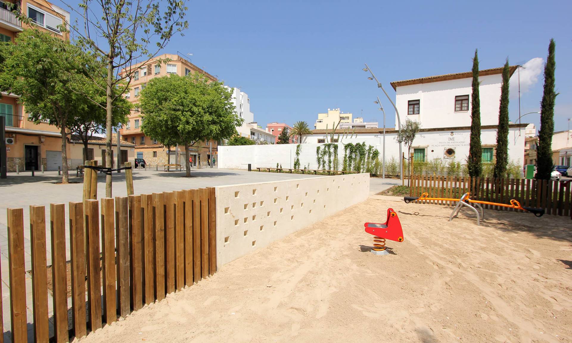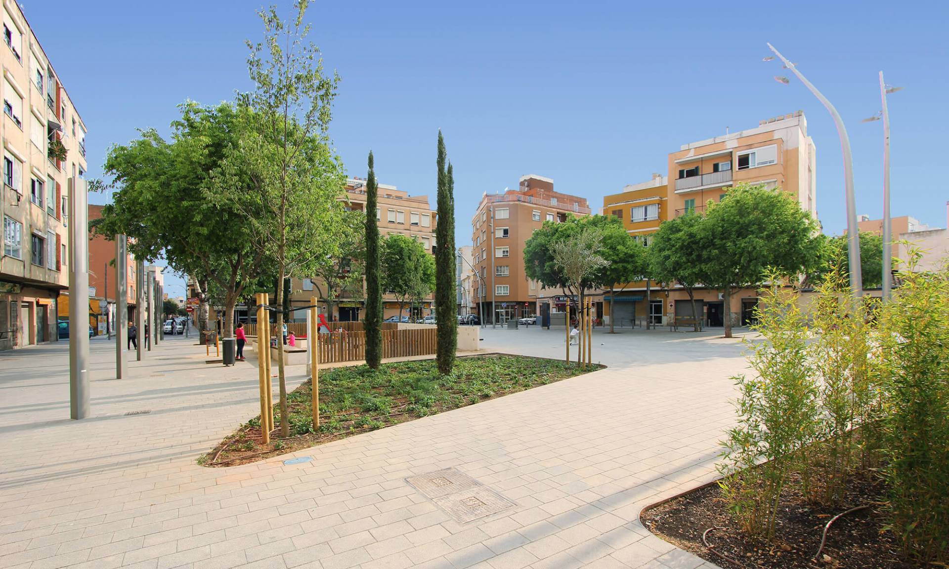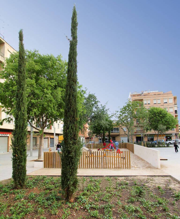 Se conservan en su totalidad los árboles existentes, especialmente en el área de juegos infantil donde confluirían los árboles existentes con los nuevos almeces, cipreses y acebuches.