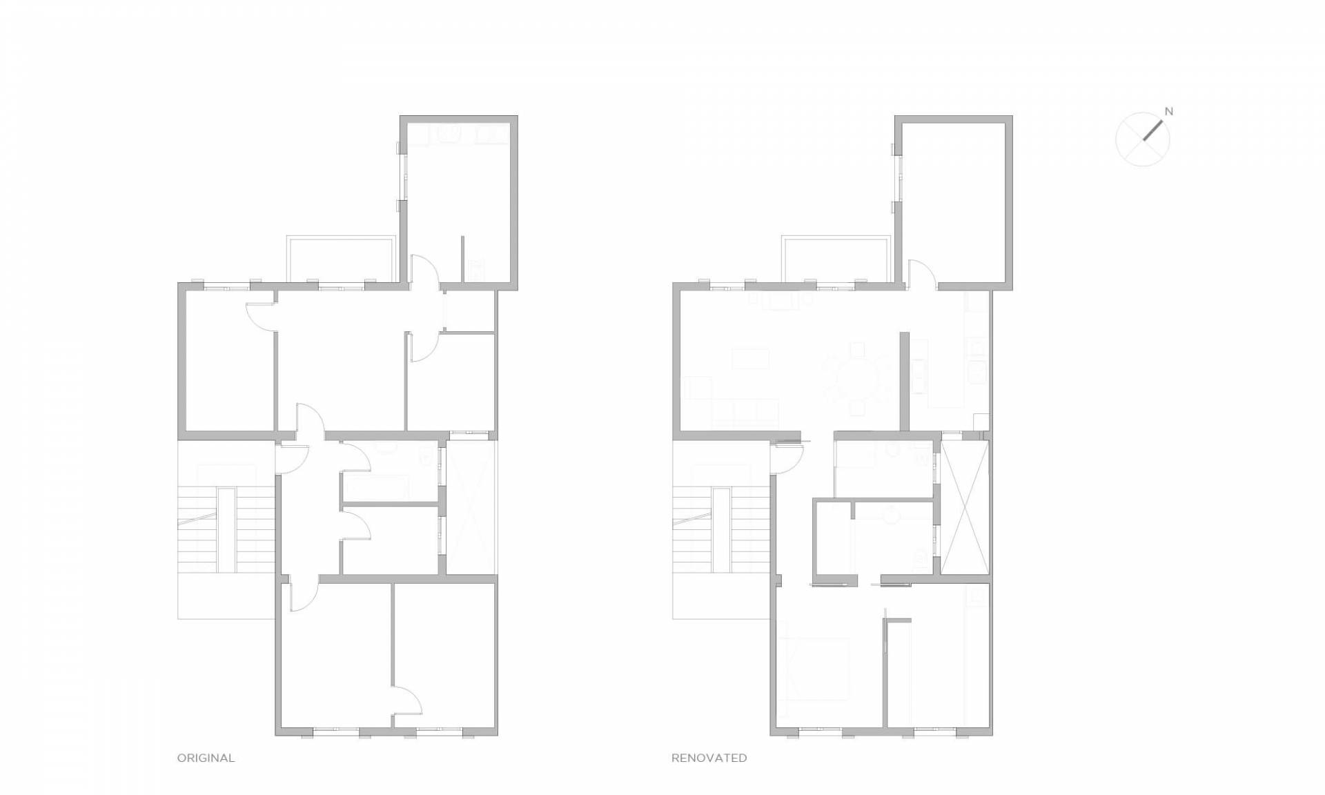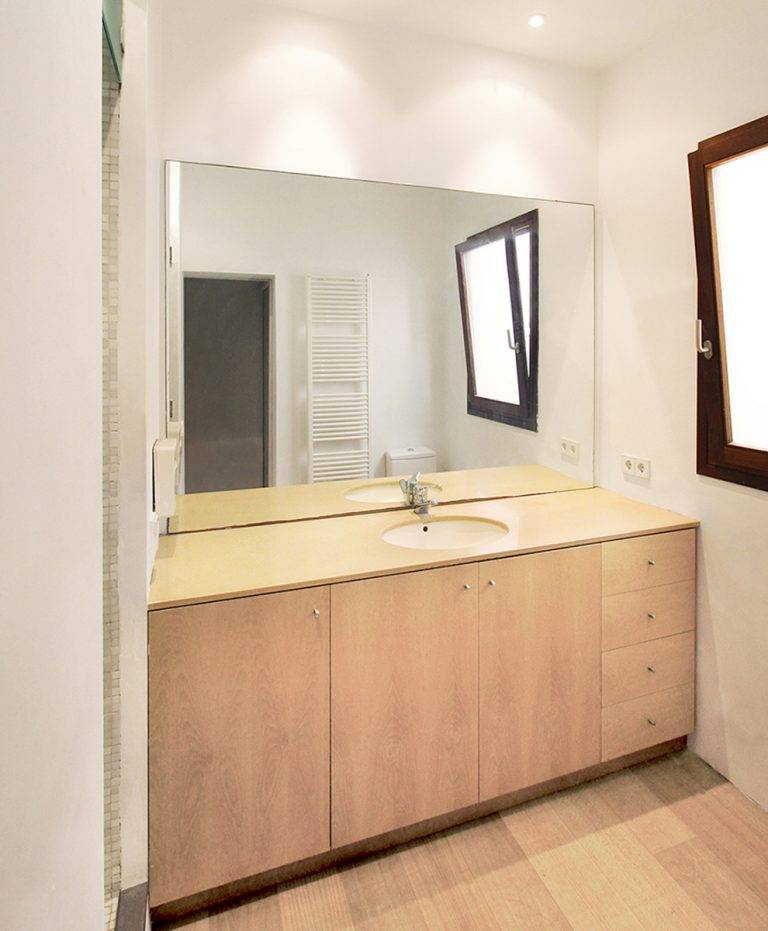 Se renueva completamente la distribución, instalaciones y acabados, suprimiendo algunas estancias con el fin de unificar espacios. De esta manera la cocina, comedor y estar participan de un único ámbito, relacionándose de manera abierta.