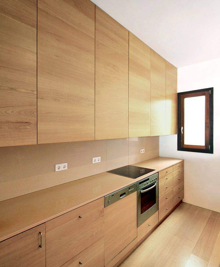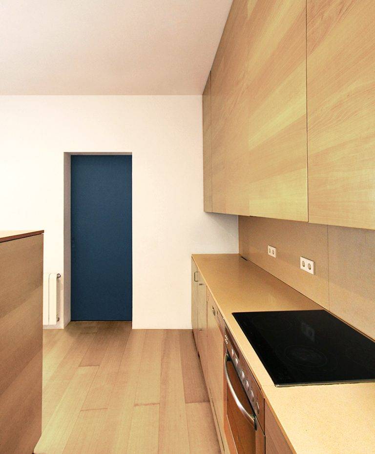 La madera de haya se utiliza en el suelo de parquet y como material de acabado en la cocina, consiguiendo así una continuidad visual con el plano horizontal y el vertical.