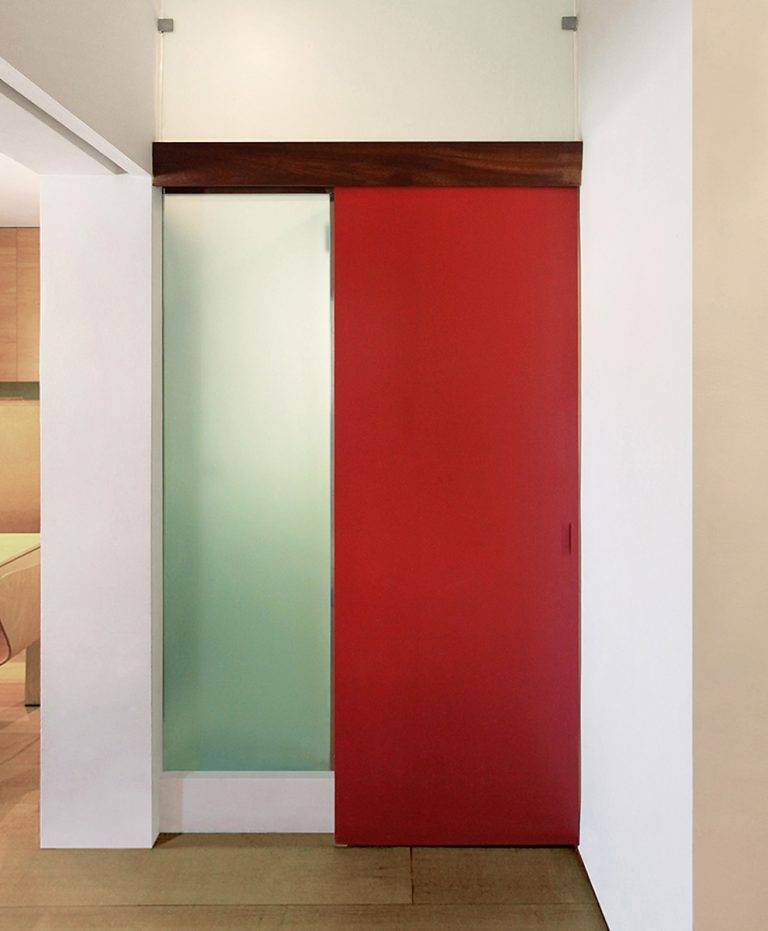 Todas las puertas de la vivienda son correderas, permitiendo un mayor aprovechamiento del espacio. Realizadas con diversos materiales y colores: cristal translucido, DM lacado en blanco, rojo y azul, consiguen dar un acento pictórico al conjunto, contrastando sobre el blanco de paredes y techos.